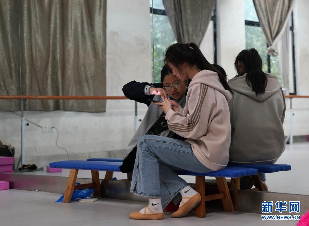 2021年5月11日,蔣張子怡(左)在學校的舞蹈房內和同學交流舞蹈動作。