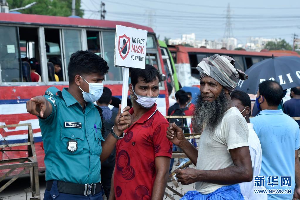 5月17日,警察在孟加拉國首都達(dá)卡的車站手舉佩戴口罩的提示牌,要求從各地返回達(dá)卡的人們注意防護(hù)安全。