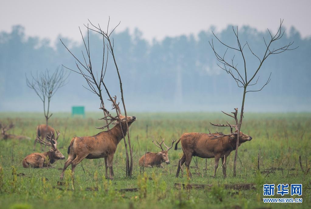 5月17日,一群麋鹿在石首麋鹿國(guó)家級(jí)自然保護(hù)區(qū)內(nèi)活動(dòng)。新華社記者 肖藝九 攝