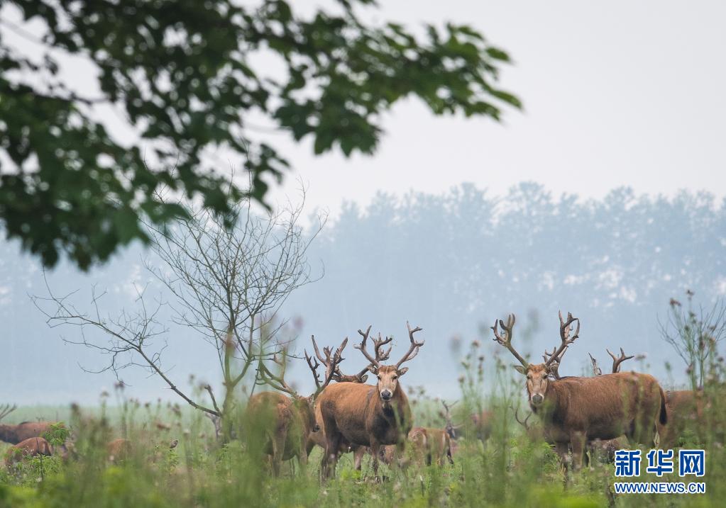 5月17日,一群麋鹿在石首麋鹿國家級自然保護區內活動。新華社記者 肖藝九 攝