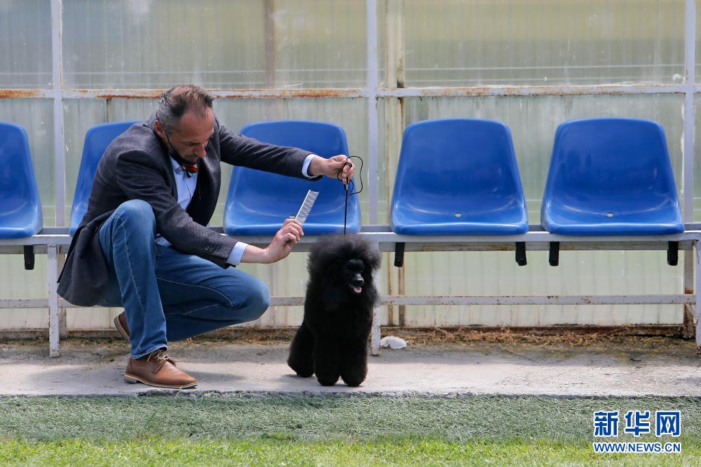 5月23日,一名男子在羅馬尼亞首都布加勒斯特為愛犬參加選美比賽做準備。新華社發(克里斯泰爾攝)