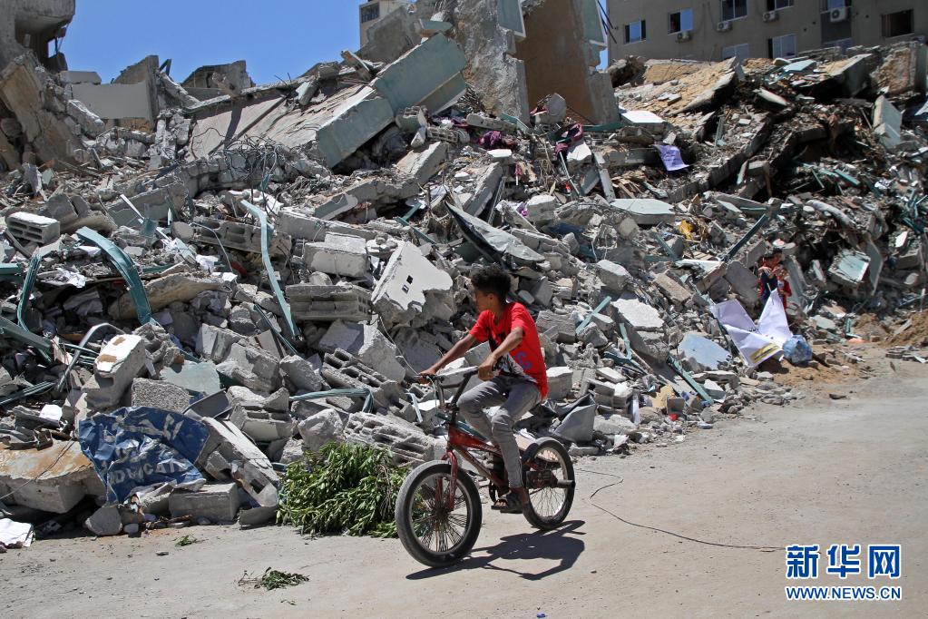 5月23日,一個(gè)男孩在加沙城騎車(chē)經(jīng)過(guò)遭以軍空襲損毀的賈拉塔。5月10日以來(lái),以色列與加沙地帶武裝組織之間爆發(fā)嚴(yán)重沖突。20日晚,哈馬斯與以色列方面各自宣布,雙方已達(dá)成停火協(xié)議,停火從21日凌晨開(kāi)始。新華社發(fā)(里澤克·阿卜杜勒·賈瓦德攝)