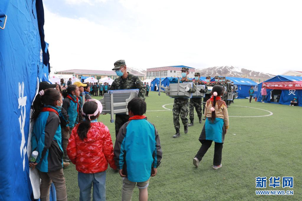 5月24日,武警青??傟牴逯ш牂C動大隊排長張國睿(前一)和戰友為花石峽鎮藏文中心寄宿制小學的帳篷教室搬運課桌。新華社記者 劉芳 攝