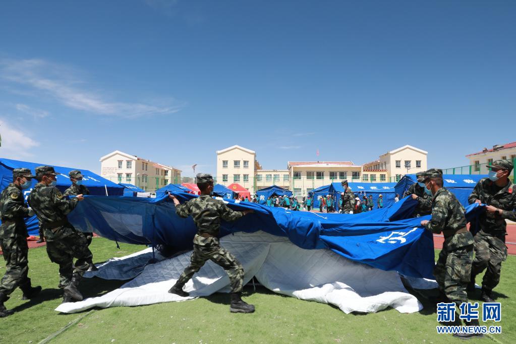 5月24日,武警青??傟?duì)果洛支隊(duì)機(jī)動(dòng)大隊(duì)官兵為花石峽鎮(zhèn)藏文中心寄宿制小學(xué)搭建帳篷教室。新華社記者 劉芳 攝