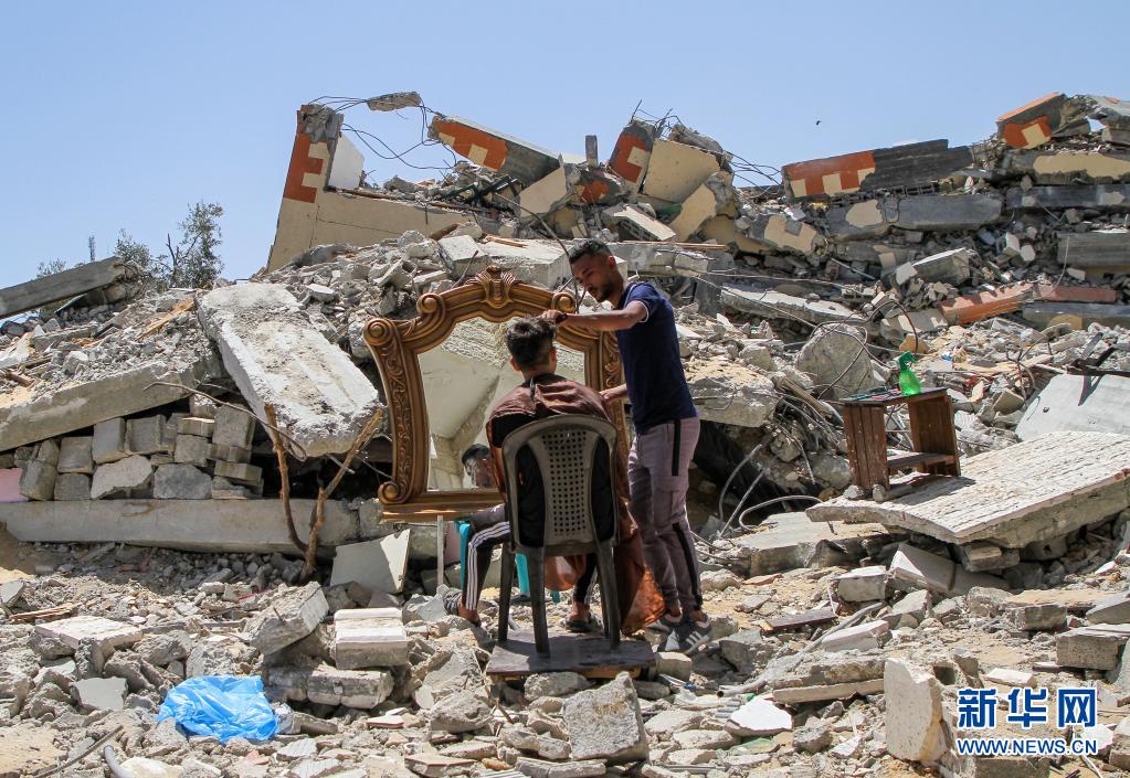 5月26日,在加沙地帶北部的城鎮貝特拉希亞,23歲的巴勒斯坦理發師阿卜杜拉·扎瓦拉在他被以色列炸毀的房屋前為顧客免費服務。 新華社發(里澤克·阿卜杜勒·賈瓦德攝)