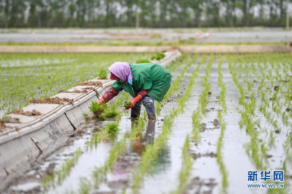 5月26日,在吉林省吉林市永吉縣萬昌鎮宇豐米業2萬畝高標準水田基地,農民進行水稻補苗工作。