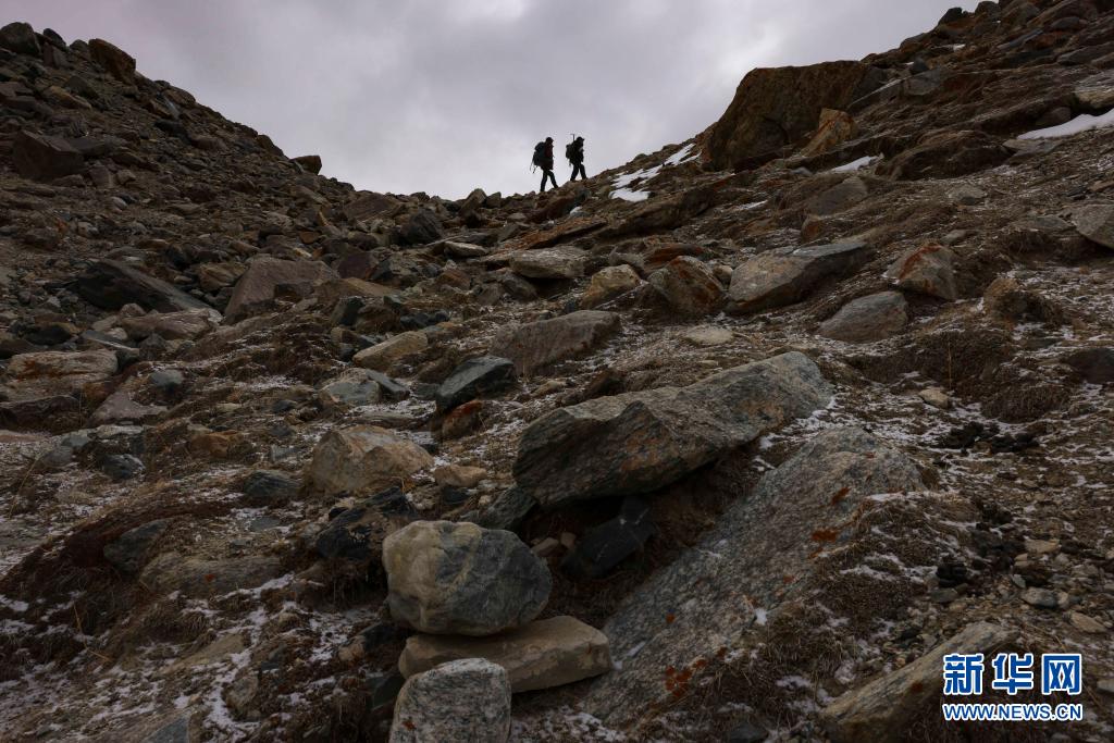 在慕士塔格峰大本營附近,別克米爾扎·圖爾達力(右)和同伴庫爾班巴依·努爾麥麥提翻越一處陡坡(5月16日攝)。新華社記者 胡虎虎 攝