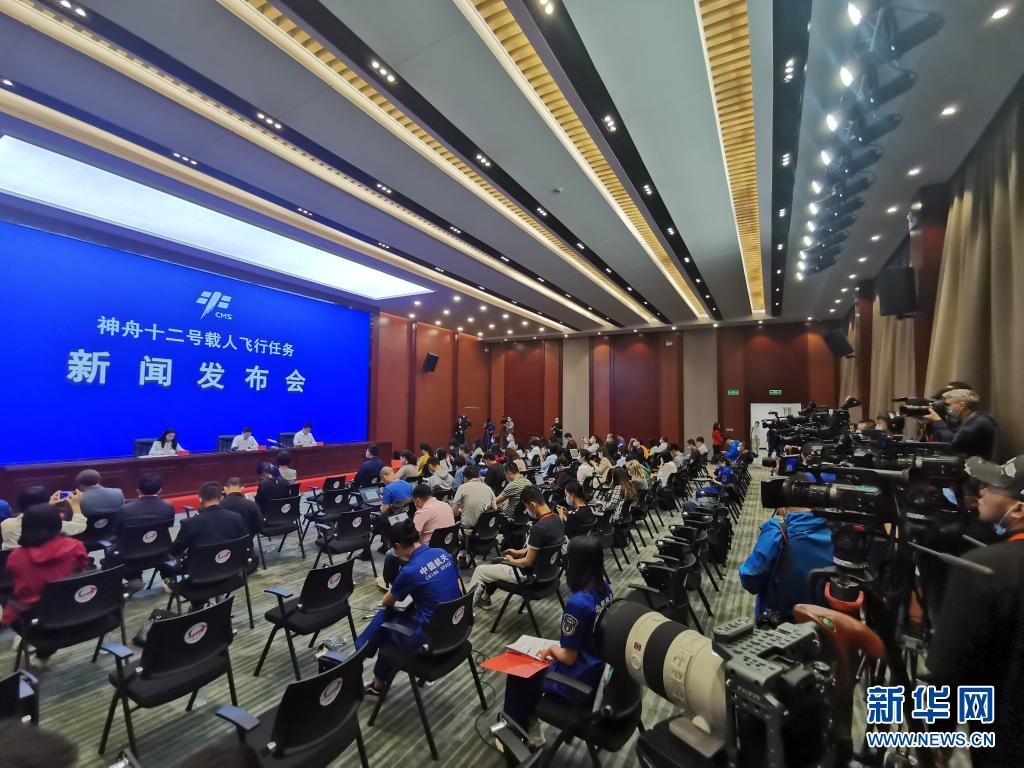 6月16日,神舟十二號載人飛行任務新聞發布會在酒泉衛星發射中心召開(手機拍攝)。