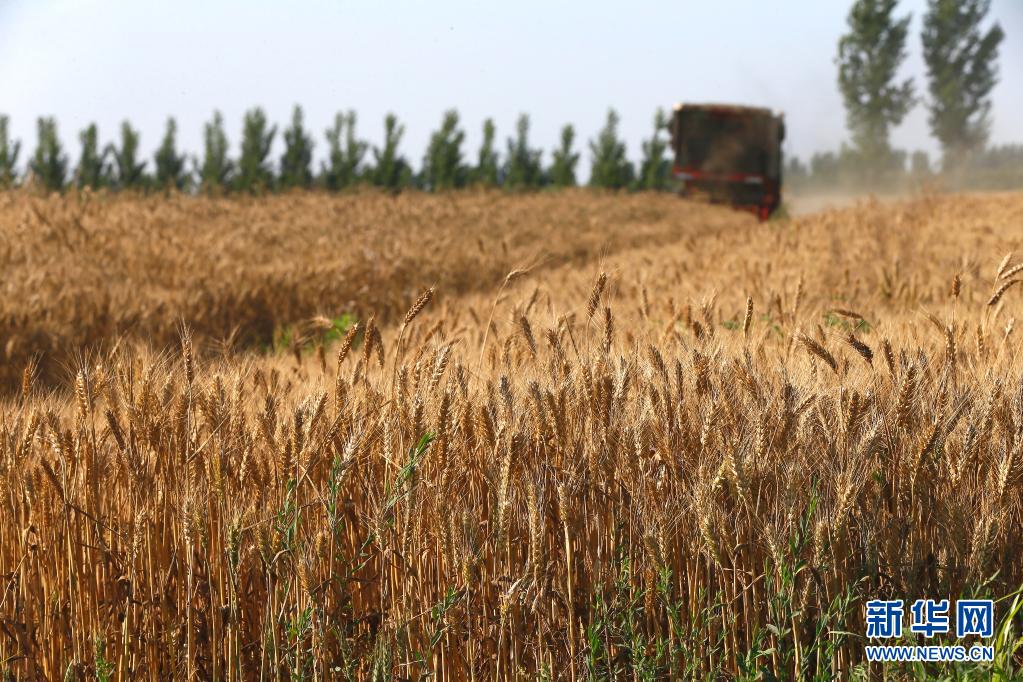 6月20日,收割機在山東省青島市即墨區段泊嵐鎮姜家坡村的麥田內作業。