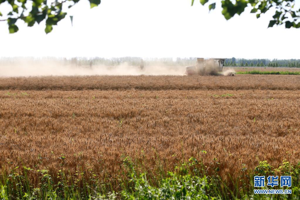 6月20日,收割機在山東省青島市即墨區段泊嵐鎮姜家坡村的麥田內作業。