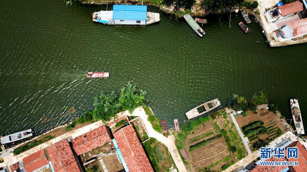 6月20日,在微山縣南陽鎮,郵遞員王少朋駕駛郵船為龔莊村村民投遞郵件。