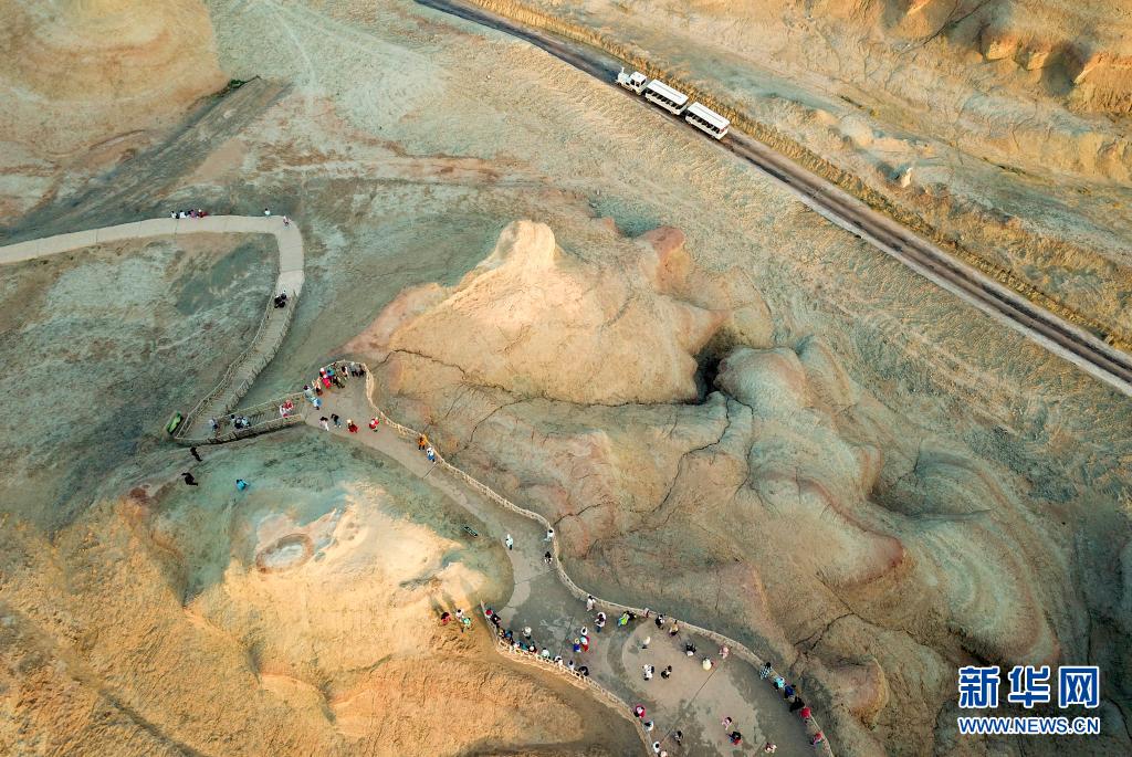 游客在新疆克拉瑪依烏爾禾世界魔鬼城景區(qū)內(nèi)拍照游玩(6月21日攝,無人機(jī)照片)。