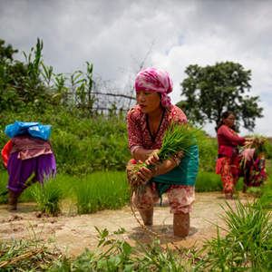 6月29日,農民在尼泊爾中部勒利德布爾附近的稻田里插秧。