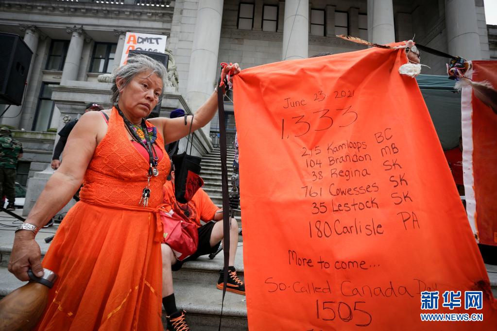 7月1日,原住民社團成員在加拿大溫哥華舉行的集會上展示近期加拿大多地發現原住民兒童遺骸的清單。
