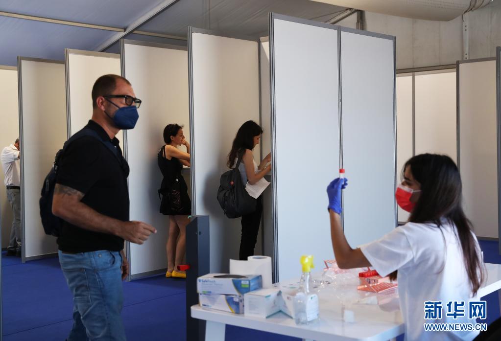 7月5日,在法國戛納為電影節注冊人員設立的新冠病毒檢測點,工作人員收集檢測樣本。