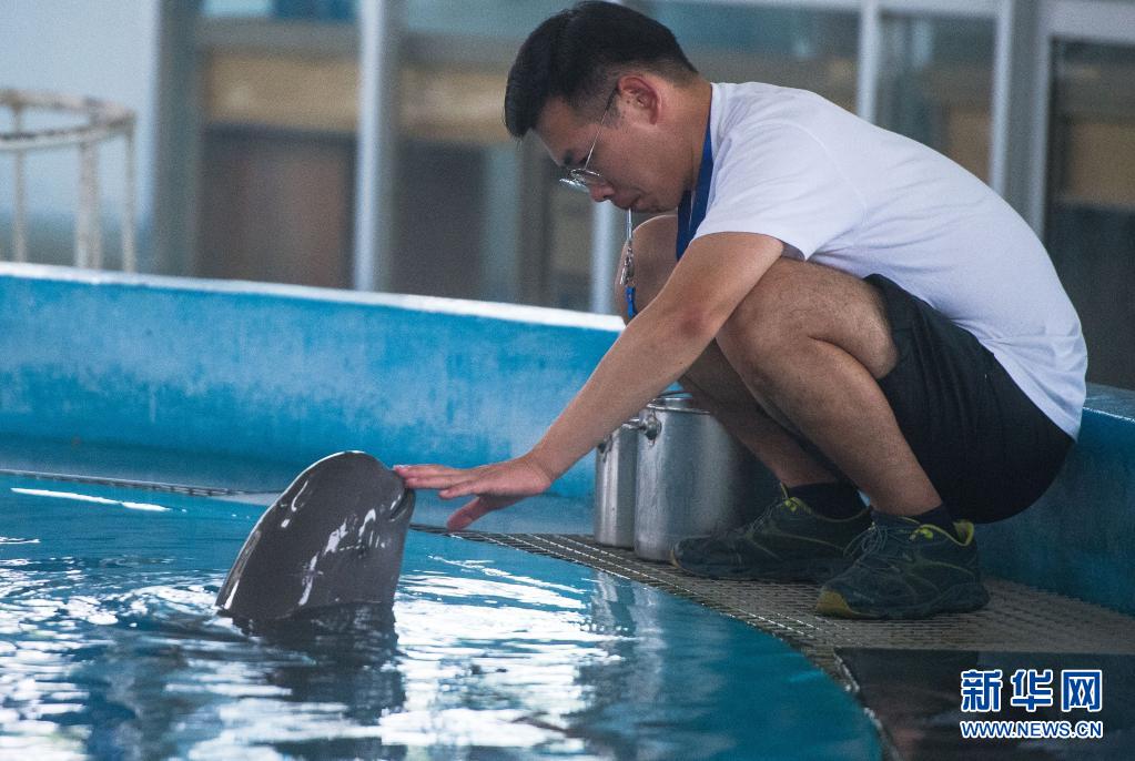 7月5日,中科院水生所白鱀豚館飼養(yǎng)員對長江江豚進行訓(xùn)練。新華社記者肖藝九攝