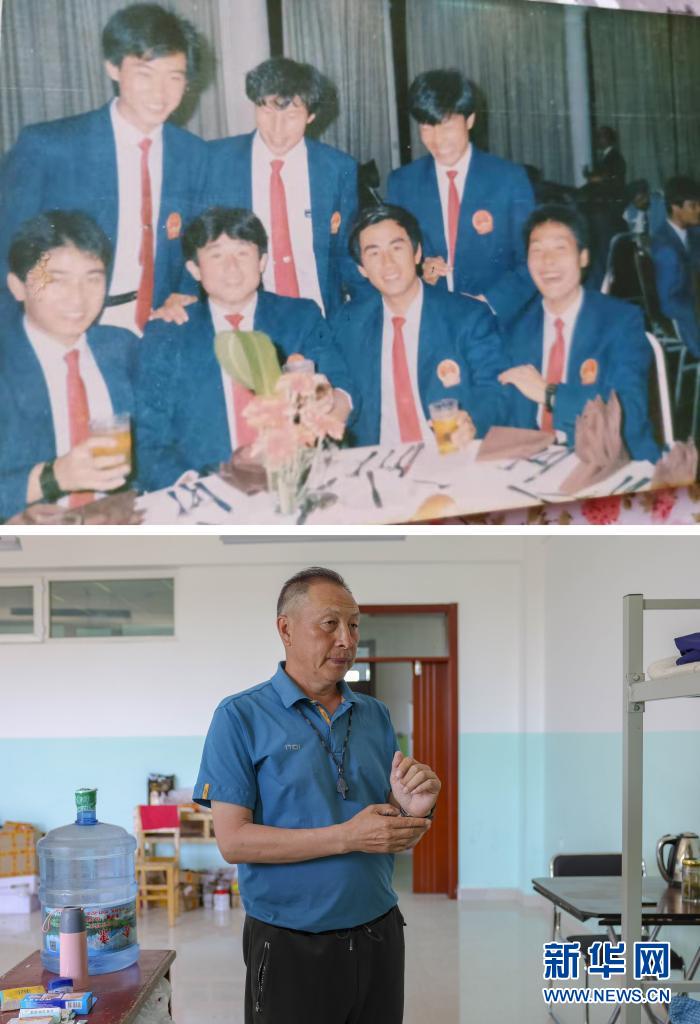 這是一張拼版照片:上圖為20世紀80年代杜寶柱(后排中)參加國際比賽時和隊員們的合影(受訪者供圖);下圖為杜寶柱教練在塔城市第二小學宿舍內整理裝備,準備出門帶隊訓練(6月12日攝,新華社記者 胡虎虎 攝)。