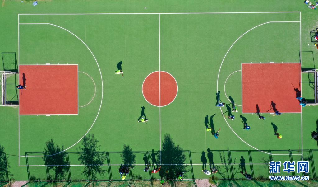 塔城市第二小學(xué)曲棍球隊的小隊員利用周末時間進行練習(xí)(6月12日攝,無人機照片)。