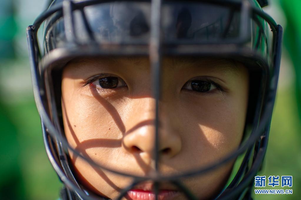身著護具的塔城市第二小學曲棍球隊員李俊杰在場上擔任守門員的角色(6月11日攝)。