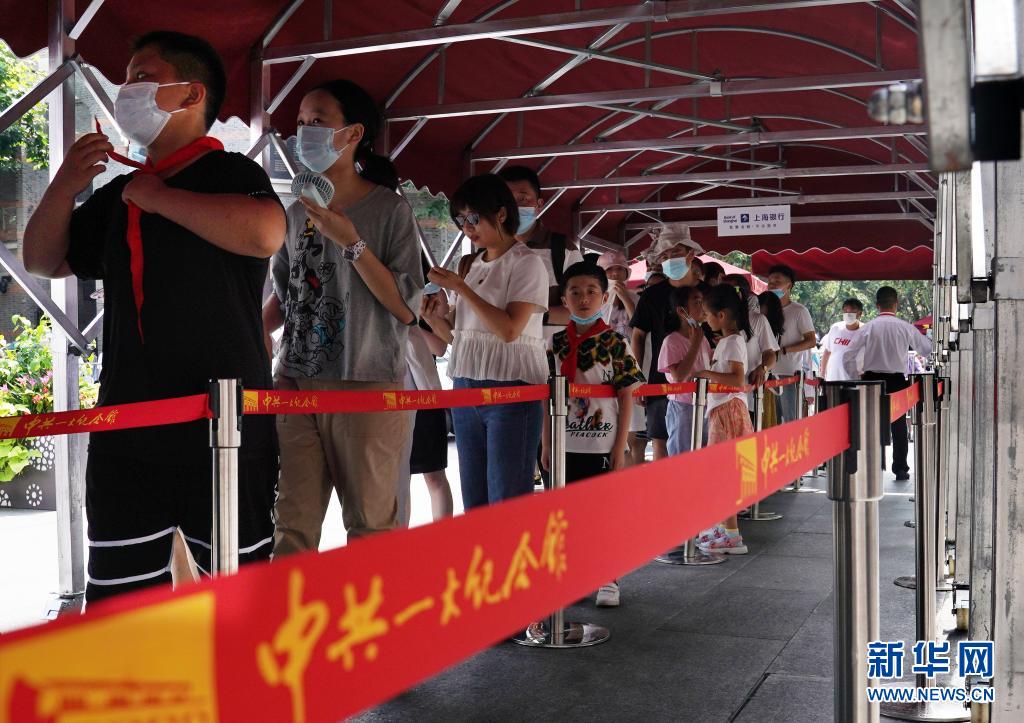 7月11日,觀眾在中共一大紀(jì)念館前的遮陽棚下排隊等待參觀。