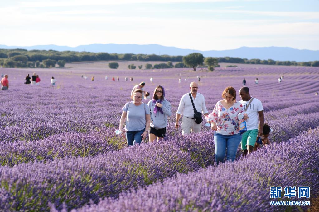 7月13日,人們在西班牙卡斯蒂利亞-拉曼查自治區布里韋加的薰衣草田游玩。