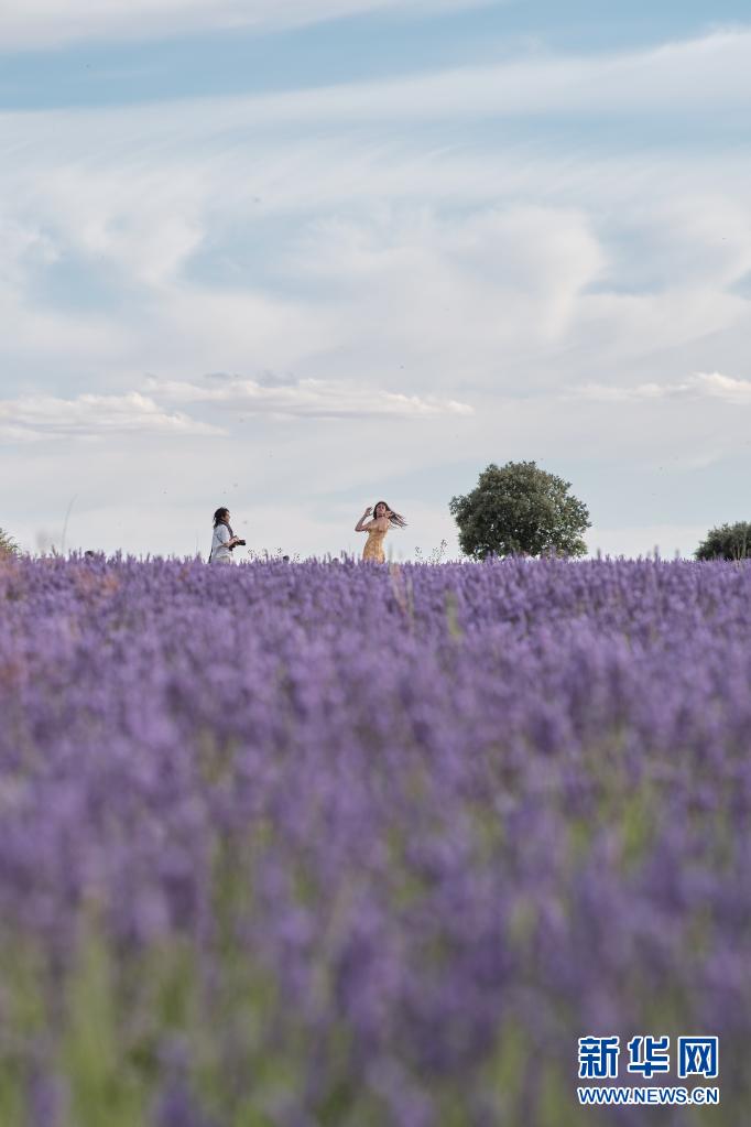 7月13日,人們在西班牙卡斯蒂利亞-拉曼查自治區布里韋加的薰衣草田游玩。
