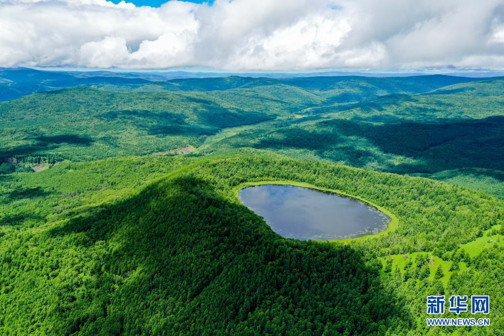這是7月14日拍攝的阿爾山國家森林公園內的天池(無人機照片)。