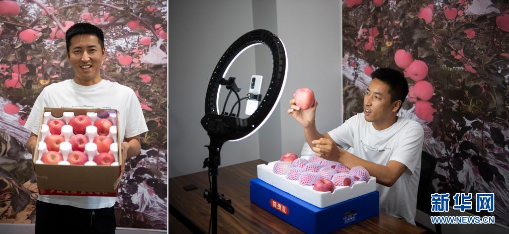 拼版照片:左圖為郭鋒杰展示山西省吉縣產(chǎn)的蘋果;右圖為郭鋒杰通過網(wǎng)絡(luò)直播銷售蘋果(7月9日攝)。今年32歲的郭鋒杰是吉縣古賢村人,常年在外從事建筑行業(yè)。吉縣有“蘋果之鄉(xiāng)”的美譽,看到吉縣蘋果在農(nóng)村電商領(lǐng)域的發(fā)展?jié)摿Γh杰經(jīng)過長期考察后,選擇返鄉(xiāng)創(chuàng)業(yè)。返鄉(xiāng)后,他忙著和果農(nóng)洽談合作,聯(lián)系各大商超,自己也開起了網(wǎng)店,做起了“主播”。