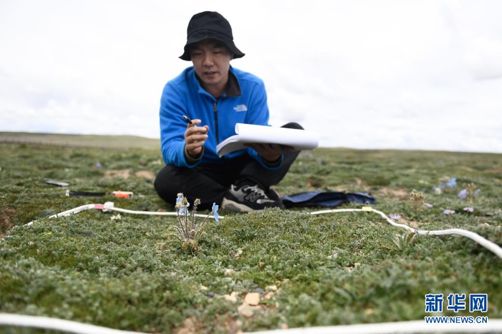 2021年長江源綜合科考的科考隊員任斐鵬在長江南源當曲地區觀察高寒草甸(7月23日攝)。