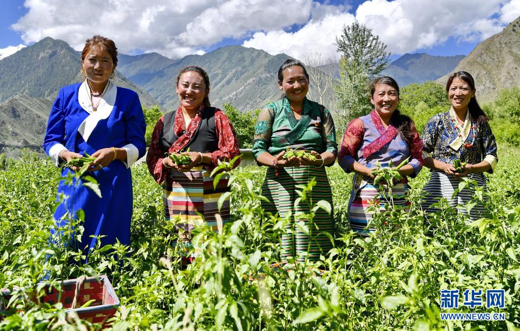 林芝市朗縣洞嘎鎮滾村的村民展示剛剛采摘的辣椒(2020年7月27日攝)。