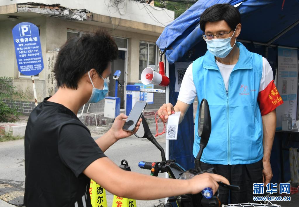 8月14日,在北京市海淀區薊門里社區出入口,馮向東(右)指導進入社區的人員掃描健康寶。