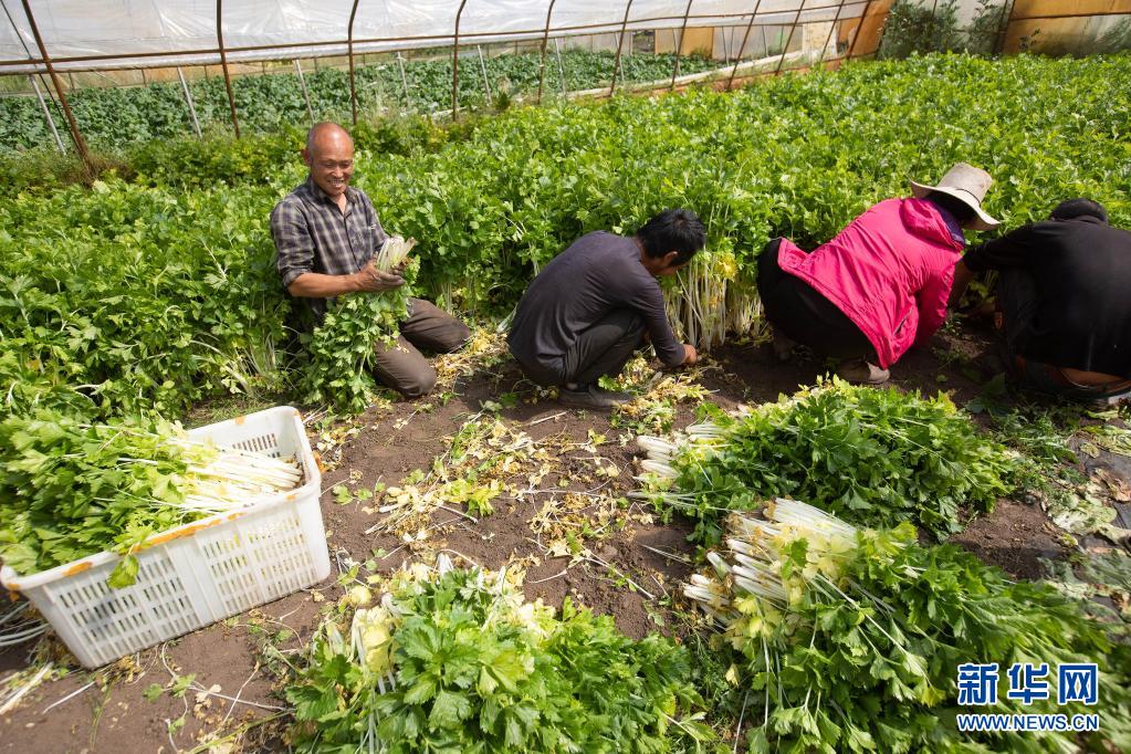 8月13日,在四川省阿壩藏族羌族自治州紅原縣邛溪鎮熱坤村的蔬菜大棚,種植戶在收割芹菜。