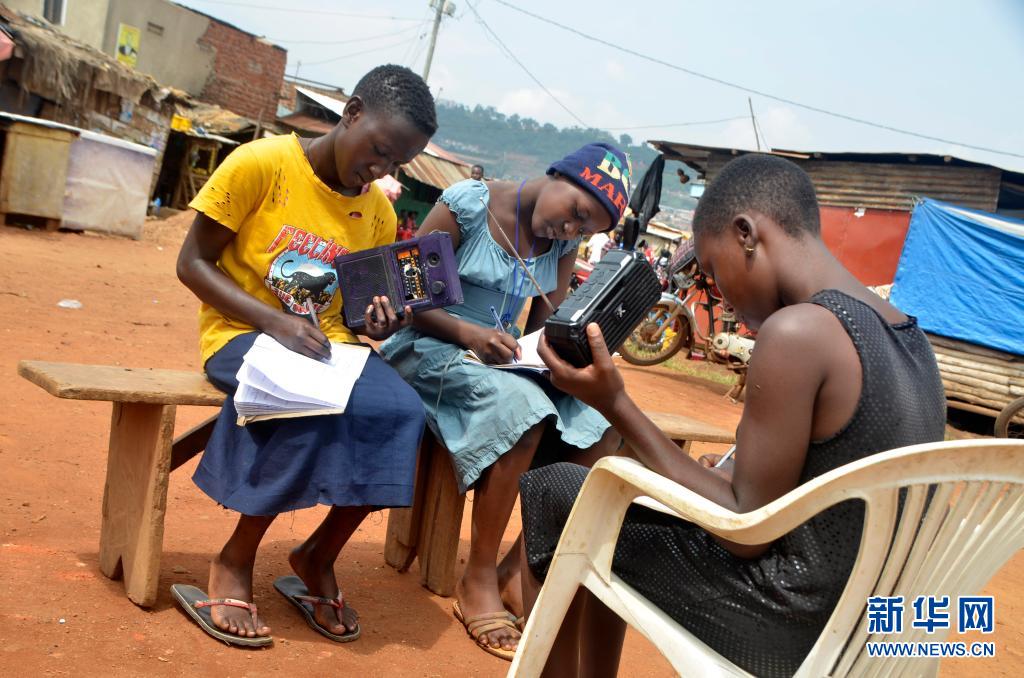 8月16日,學生在烏干達首都坎帕拉用收音機收聽無線電廣播的教學內容。