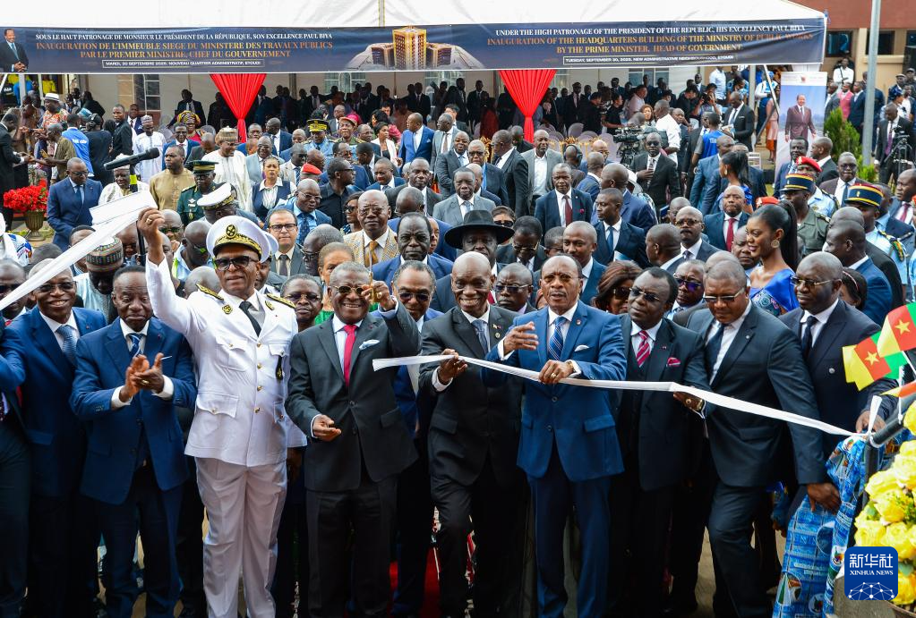 9月30日,在喀麦隆首都雅温得,喀总理恩古特(左四)在公共工程部办公大楼揭牌仪式上剪彩。