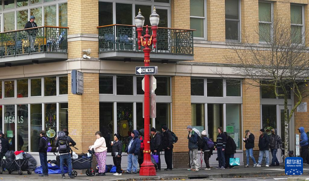 11月4日,在美国俄勒冈州波特兰,等待领取免费食物的人们排起长队。