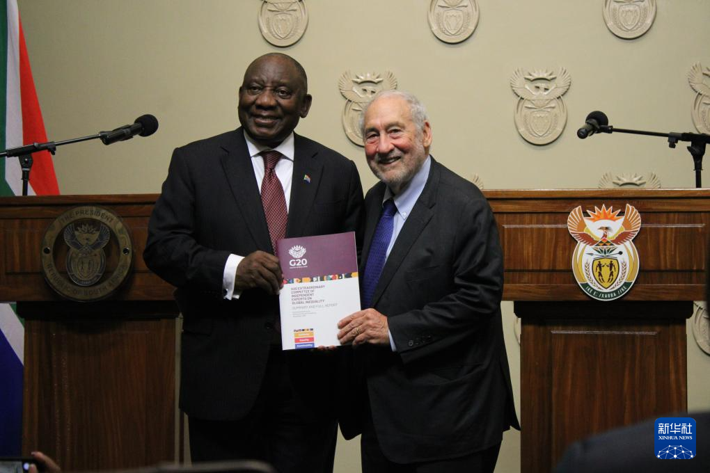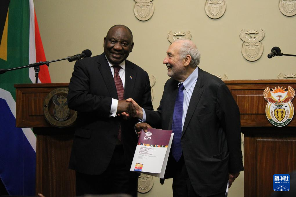 11月4日,在南非立法首都开普敦,二十国集团应对全球不平等问题特别独立专家委员会主席、诺贝尔经济学奖得主约瑟夫·施蒂格利茨(右)向南非总统拉马福萨提交关于全球不平等问题的报告。