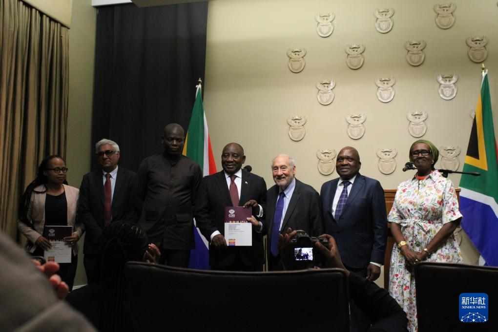11月4日,在南非立法首都开普敦,二十国集团应对全球不平等问题特别独立专家委员会主席、诺贝尔经济学奖得主约瑟夫·施蒂格利茨(右三)和专家委员会成员向南非总统拉马福萨(右四)提交关于全球不平等问题的报告。