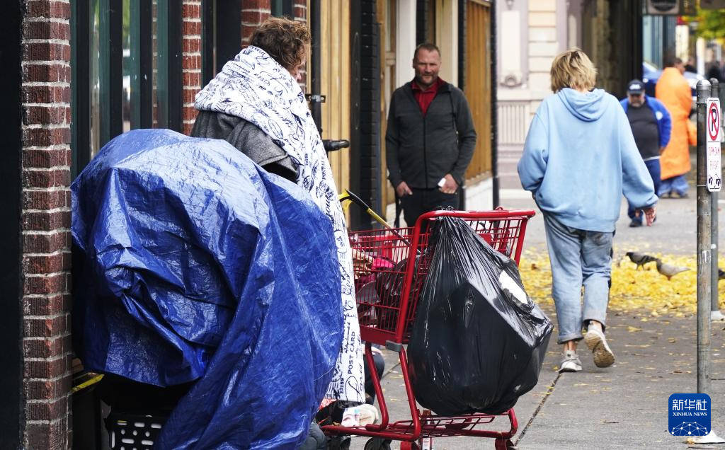 11月4日,在美国俄勒冈州波特兰,无家可归者站在街头。