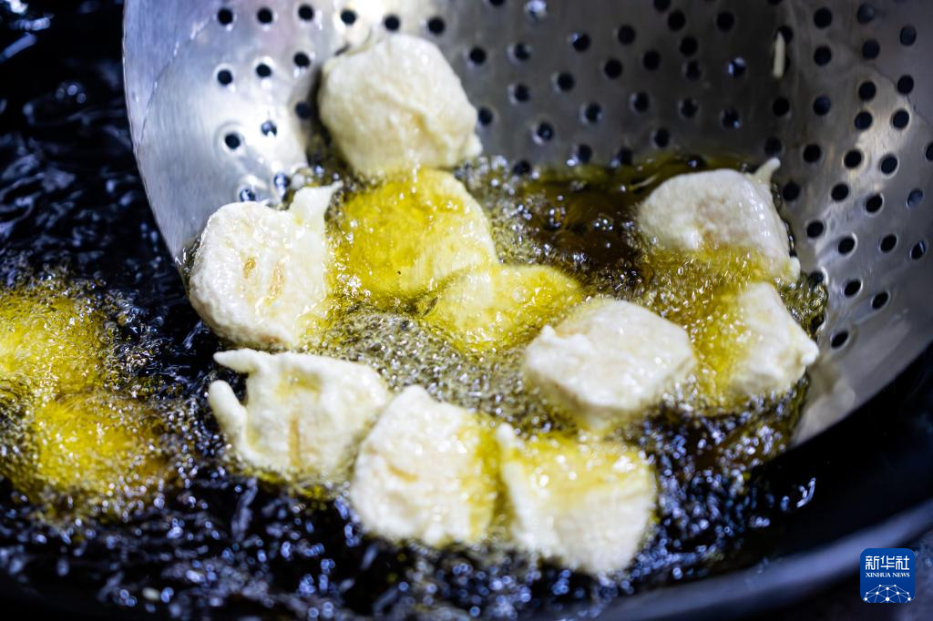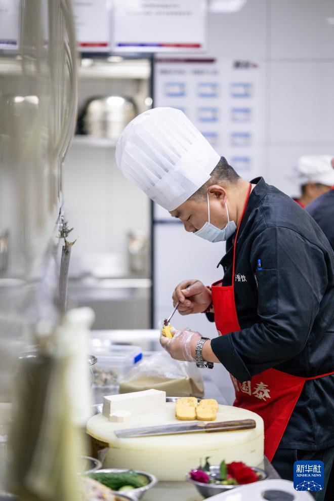 12月13日,剑门豆腐非遗传承人邓永波在四川省广元市剑阁县的一家餐厅内制作豆腐宴菜品。