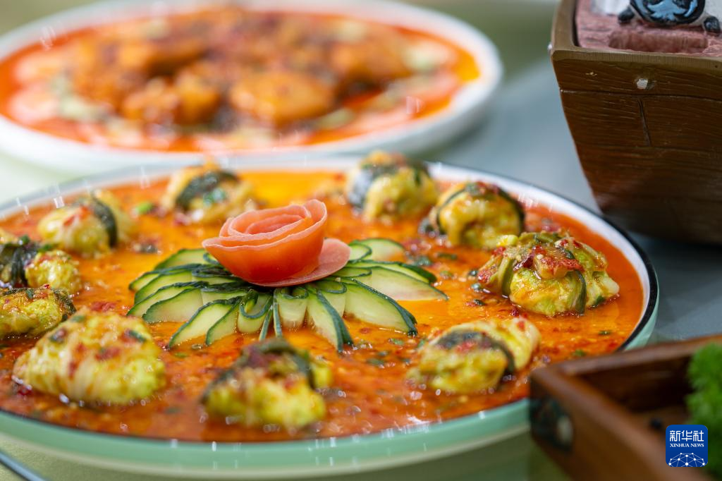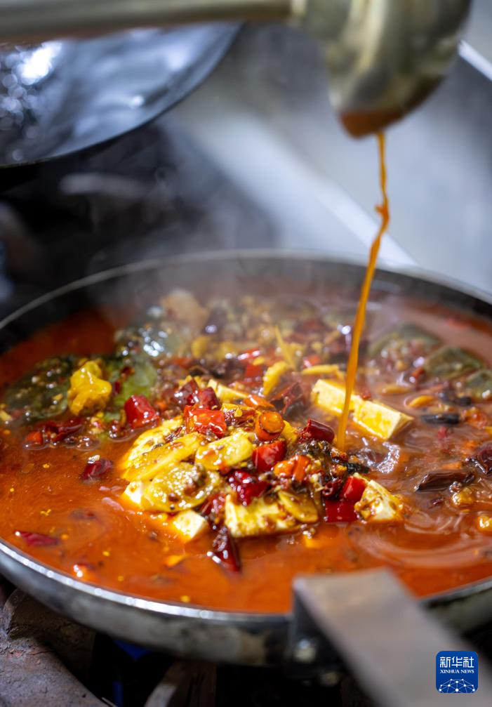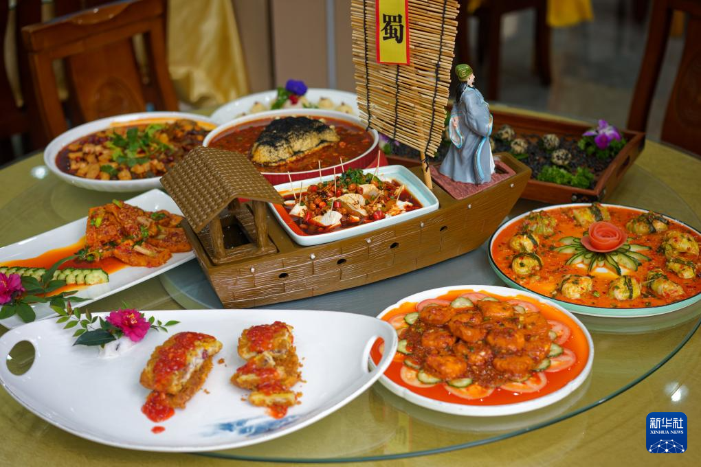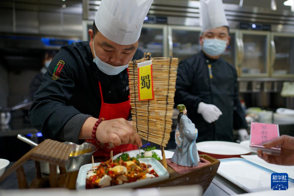 12月13日,厨师在四川省广元市剑阁县的一家餐馆内制作三国特色豆腐菜“草船借箭”。