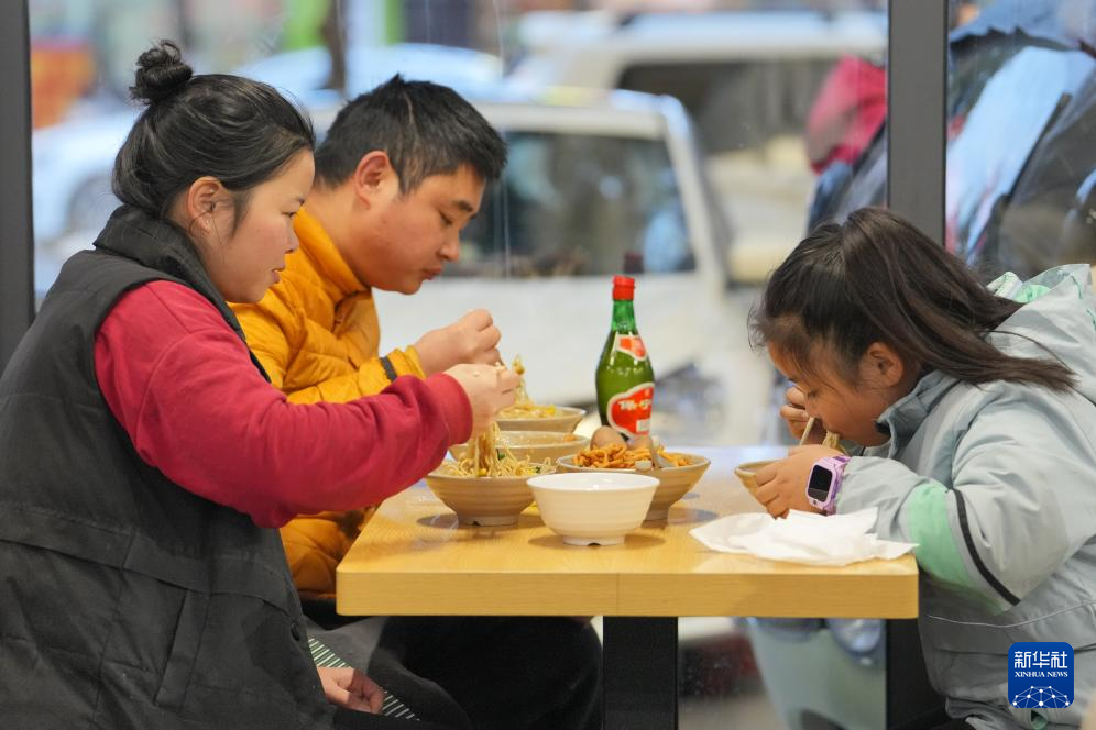 12月12日,在四川省广元市一家凉面馆,一家三口在吃凉面。