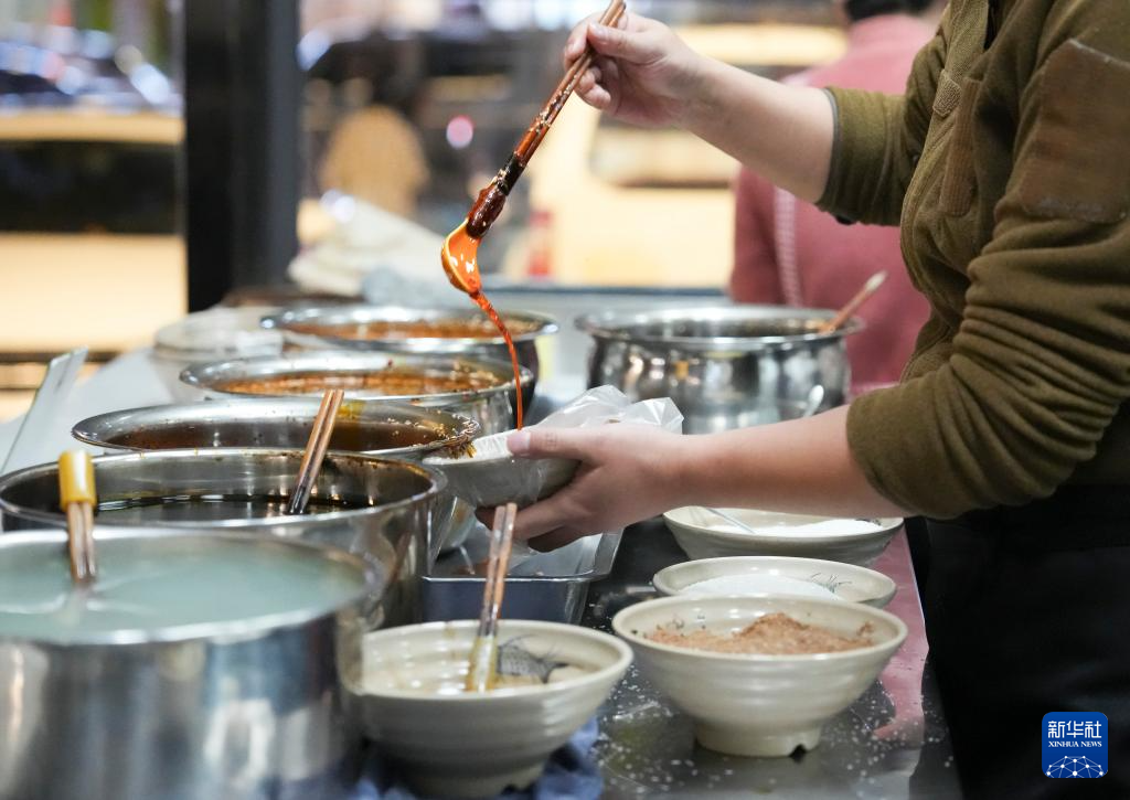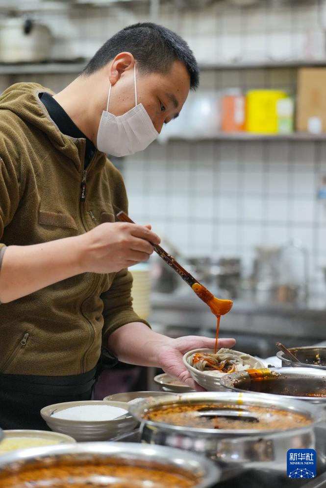 12月12日,在四川省广元市一家凉面馆,工作人员在调配凉面调料。
