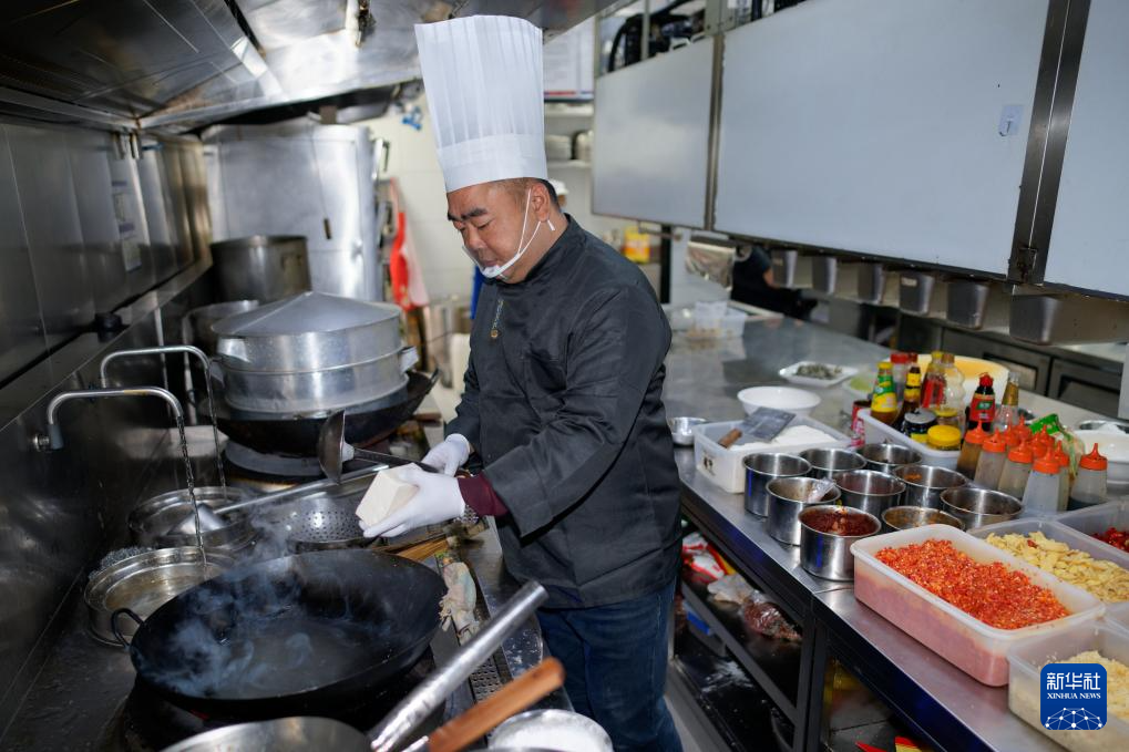 12月13日,在四川省广元市剑阁县的一家餐馆,厨师在制作豆腐宴菜品。