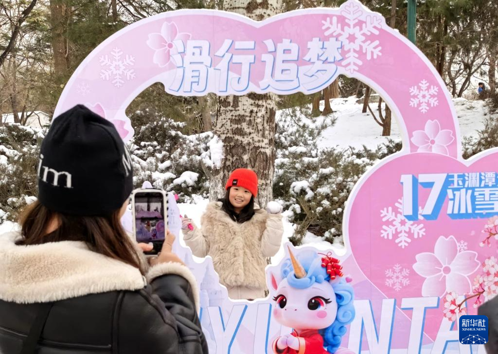 1月18日,游客在北京玉渊潭公园拍照留念。