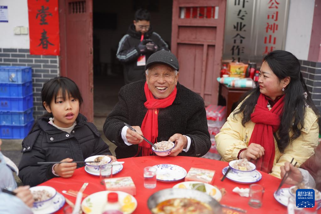村民们参加神山村举办的“神山宴”活动(2月1日摄)。