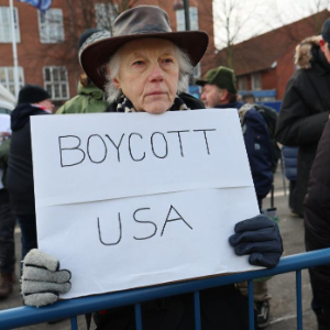1月31日,在位于丹麦首都哥本哈根的美国驻丹麦大使馆附近,一名抗议者手举“抵制美国”的标语。
