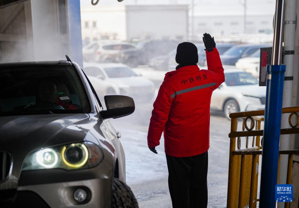 1月31日,在新疆乌鲁木齐中铁特货乌鲁木齐分公司三坪物流基地,客户黄先生目送爱车驶入列车。