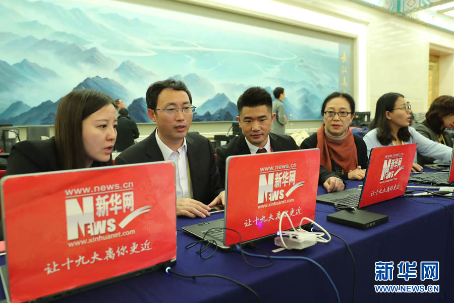 2017年10月17日下午,中國共產黨第十九次全國代表大會新聞發言人在人民大會堂三樓金色大廳舉行新聞發布會,并回答中外記者的提問。圖為新華網記者在做直播準備。新華網 翟子赫 攝