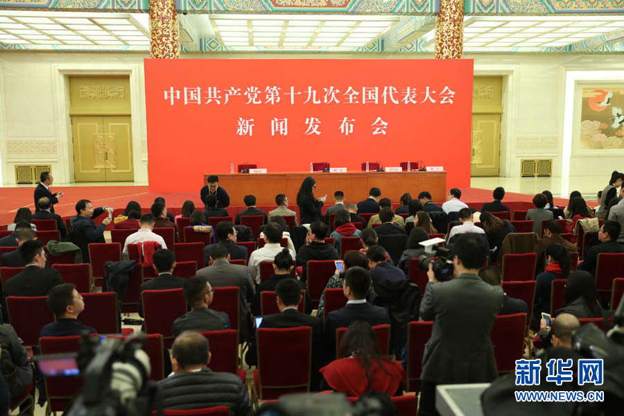 2017年10月17日下午,中國(guó)共產(chǎn)黨第十九次全國(guó)代表大會(huì)新聞發(fā)言人在人民大會(huì)堂三樓金色大廳舉行新聞發(fā)布會(huì),并回答中外記者提問。圖為新聞發(fā)布會(huì)現(xiàn)場(chǎng)。新華網(wǎng) 翟子赫 攝