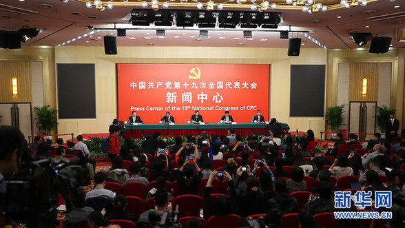 10月20日,十九大新聞中心舉行記者會,邀請中宣部、中央文明辦、文化部、新聞出版廣電總局相關負責人介紹加強思想道德和文化建設情況,并回答記者提問。圖為記者會現場。新華網 郝廣鵬 攝